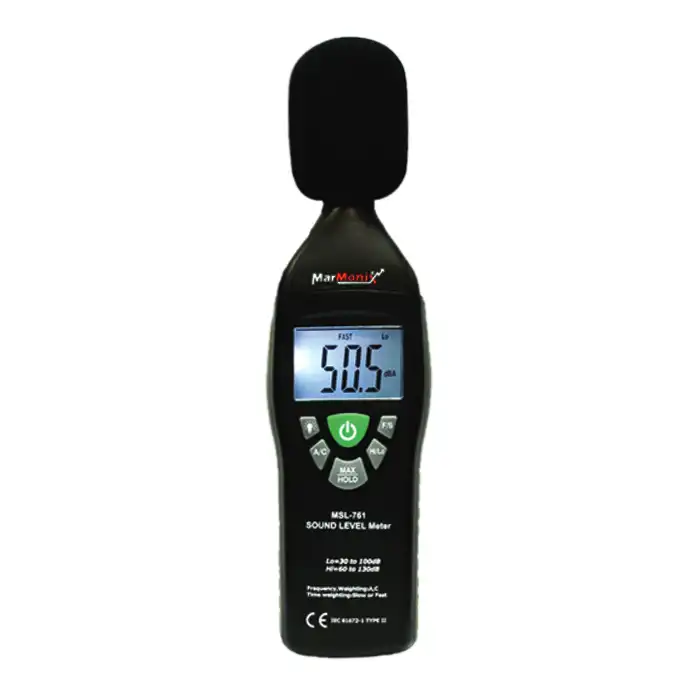 The MarMonix MSL-761 Mini Sound Level Meter offers precise sound measurements from 30 dB to 130 dB with A and C frequency weighting, fast/slow response settings, and a clear 4-digit LCD display. Compact and reliable for various applications.